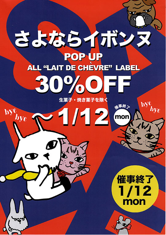 2026.01.03 さよならイボンヌ・30%OFFセール開催中「レ・ド シェーブル」出店終了のお知らせ【最終営業日】1月12日(月) 催事レ・ド・シェーブル モナカ一階「レ・ド・シェーブル(POPUP、スイーツスタンド)」は1月12日(月)をもちまして催事を終了することとなりました。 現在、30%OFF(生菓子・焼き菓子を除く)の「さよならイボンヌセール」を開催中ですのでぜひ足をお運びくださいませ。 < ALL > EVENT & SHOP NEWS一覧