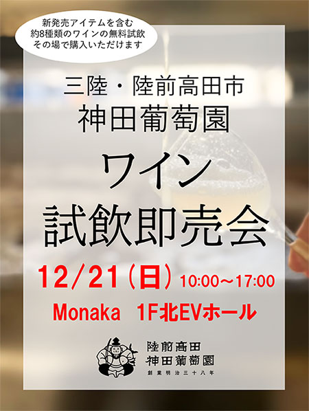 新発売アイテムを含む約8種類のワインの無料試飲ができ、その場でご購入いただけます。