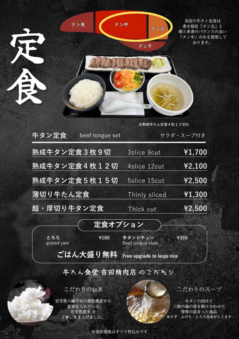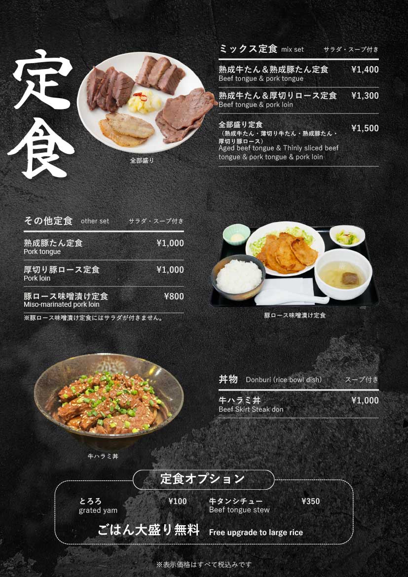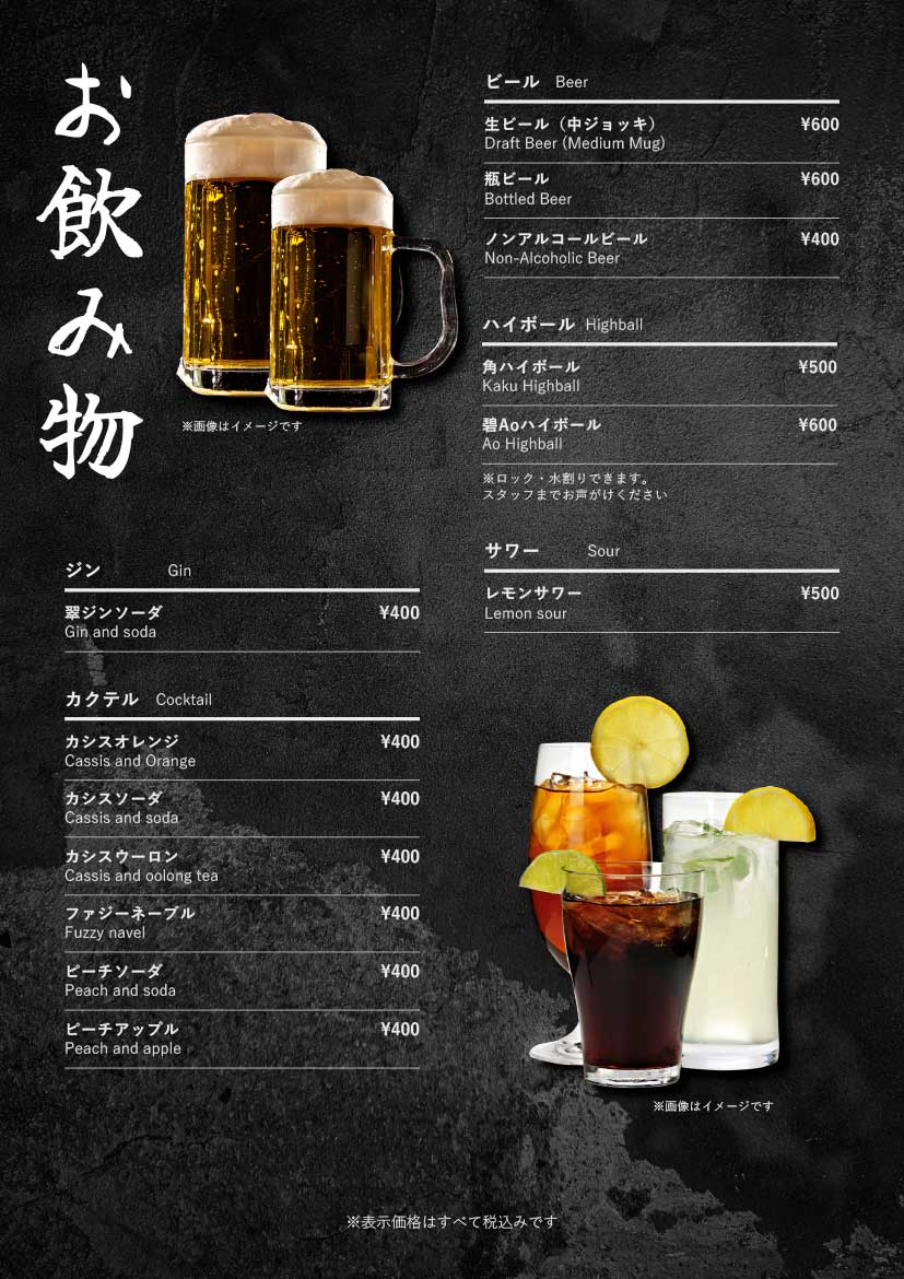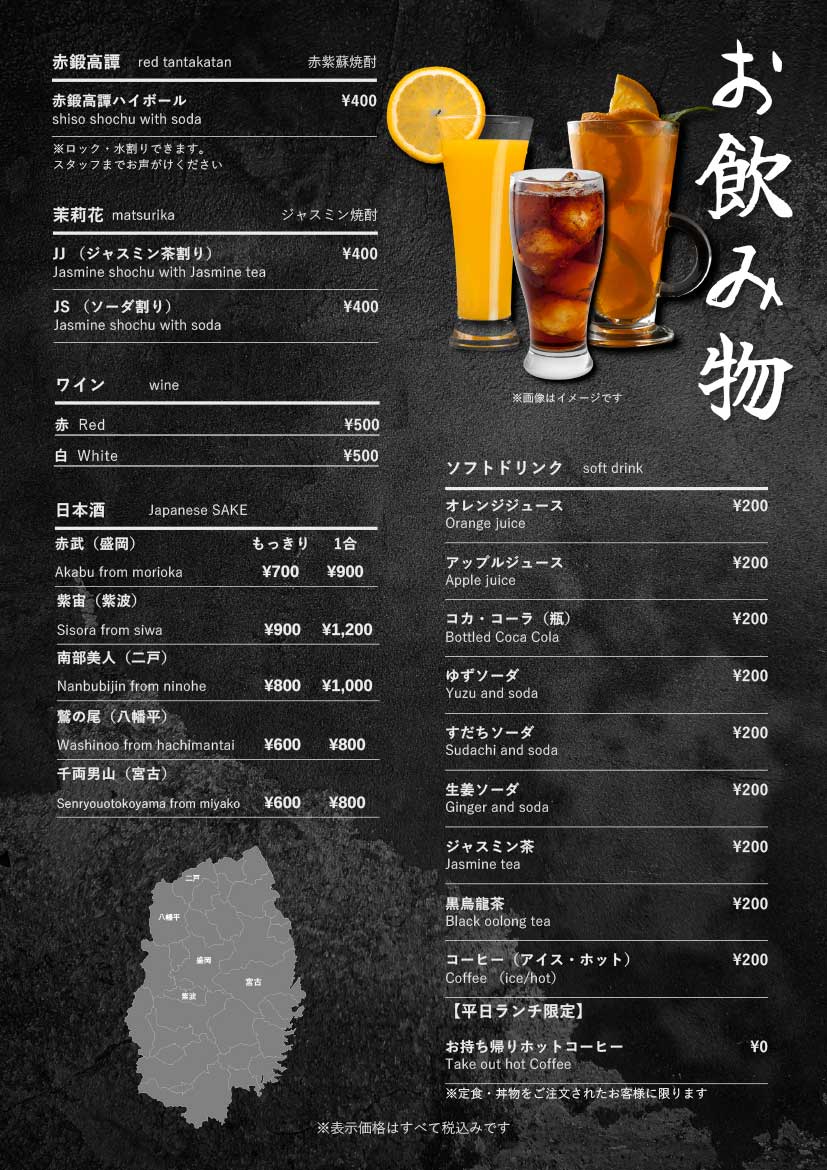 | 【午前の部】11:00~15:00(LO 14:30) 【午後の部】17:00~21:00(LO 20:30) ※さんさ等、平日のイベント日は臨時延長を行う場合あり |